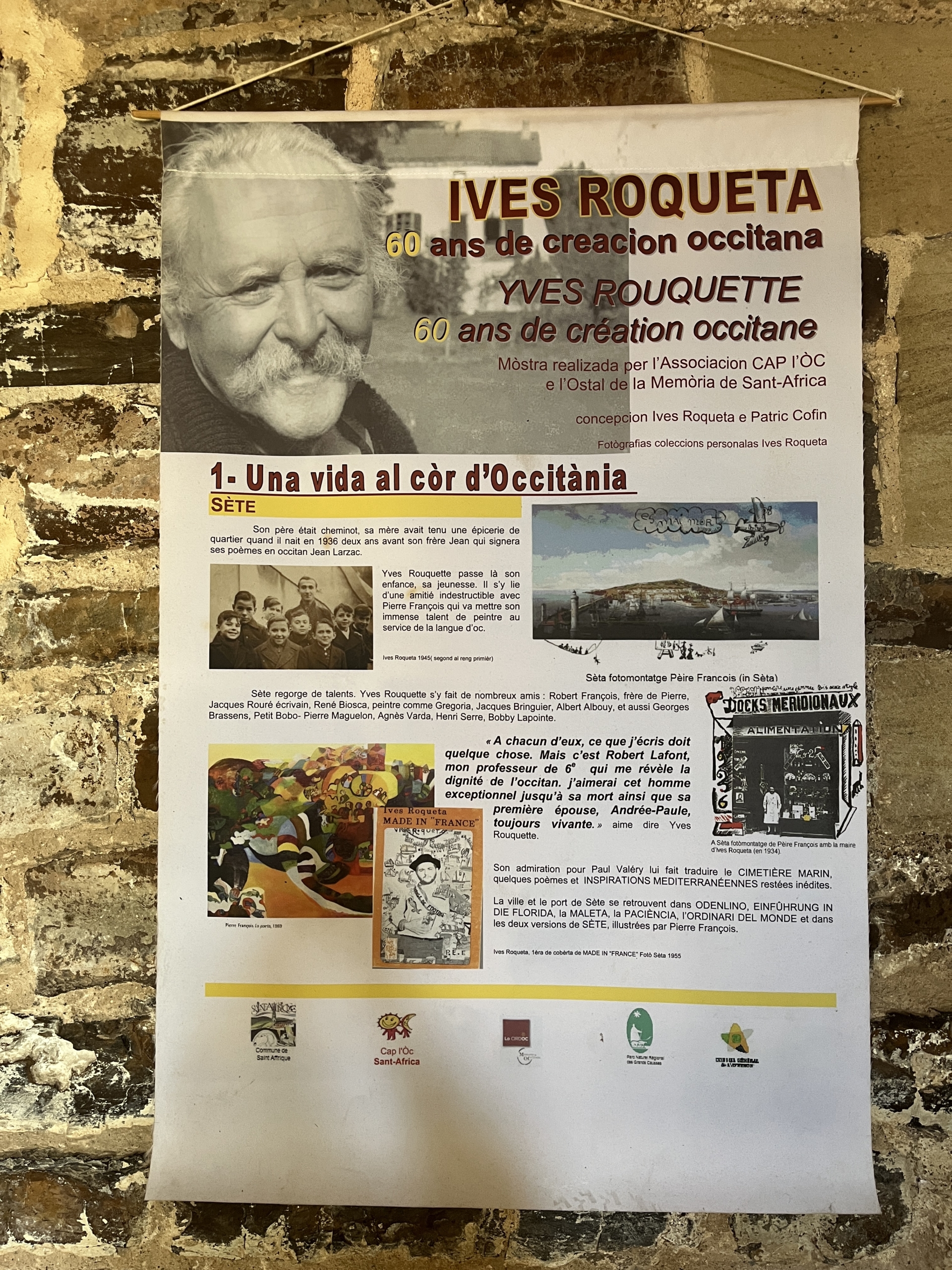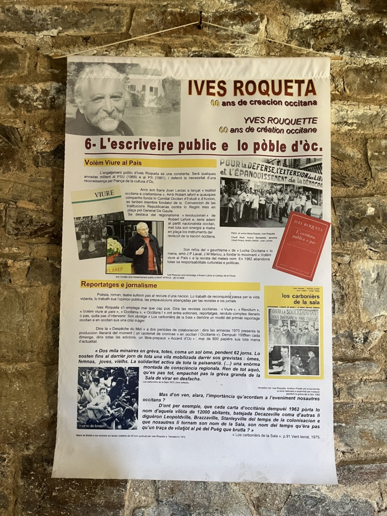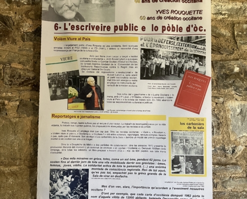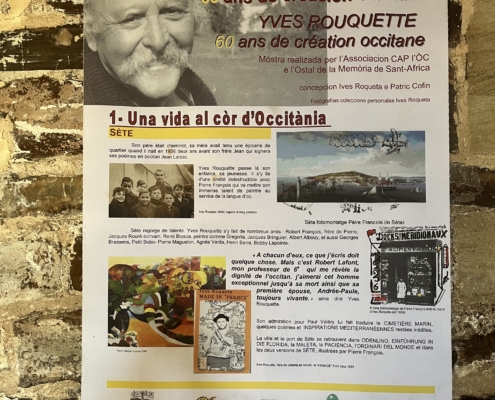 Cette exposition est illustrée des documents personnels de ce dernier géant des lettres d’Òc et présente l’ensemble de son engagement, l’engagement d’une vie pour l’occitan et les occitans. C’est là la permanence de la pensée et de la parole de l’écrivain. Yves Rouquette s’est fait écrivain public pour porter la parole du peuple d’Òc. Parole vivante, mémoire vivante, mémoire néolithique et mémoire au présent dans les poèmes, les récits, les romans, les contes… Neuf panneaux thématiques richement documentés et illustrés sont à parcourir : Sèta – La Sèrra, Besièrs – la lenga dòc a las tripas e al còr – s’engatjar dins totes los possibles – lo poèta, l’escrivan, lo pòble – l’escriveire public e lo pòble d’òc – lo poèta e lo pòble d’òc.